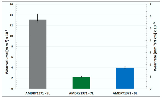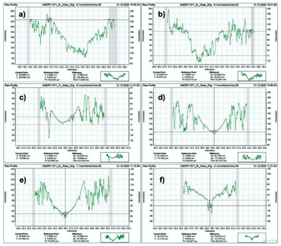 The deep scratches in the middle area of sample 9L can be seen by the transversal profile image from Figure 12f, this remark being in close correlation with the results presented in Section 3.5.1. The computed wear rate, W, in mm3/N∙m, expressed by Equation (1), from [33], is represented in Figure 10.