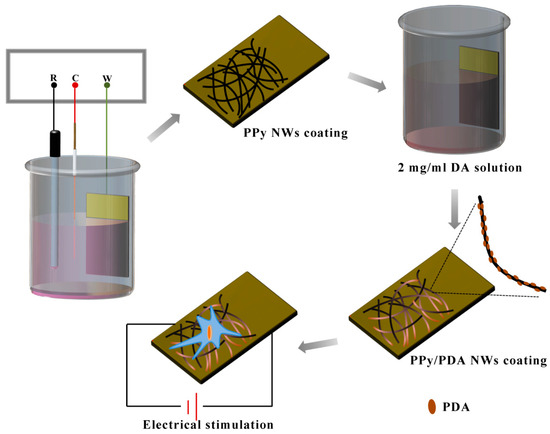 The PPy/PDA NWs coating was fabricated via a two-step method. In brief, the first step was the polymerization of PPy NWs layer by electrochemical deposition, and the second step was the deposition of PDA layer on the surfaces of PPy NWs via solution oxidation.
