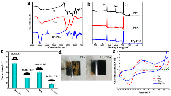 PDA had better hydrophilicity than PPy due to rich hydrophilic groups. The contact angle measurement displayed the change of surface hydrophilicity after PDA deposition (Figure 4c). For the bare Au surface, it had large hydrophobicity, which the average contact angle was more than 90°. After the Au surface was covered by PPy NWs or pure PDA, the water contact angle decreased more than 30°, and nanowire morphology was more conducive to the decrease of contact angle. The PPy/PDA NWs coating had the minimum water contact angle, which was only 16°. The excellent hydrophilicity of PPy/PDA composite mainly came from both the rough porous nanostructure and a large number of exposed hydrophilic groups such as ammonia hydroxyl groups on the surface of PDA.