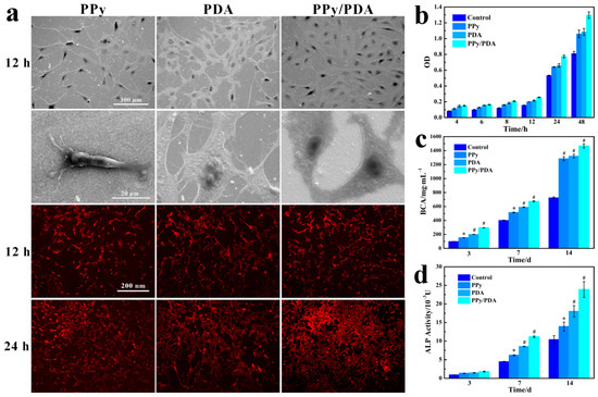 (a) SEM and fluorescence images of MC3T3-E1 cells on PPy NWs, PDA and PPy/PDA NWs cultured for 12 h and 24 h. (b) Proliferation of MC3T3-E1 cells on different coatings. (c) The protein content of MC3T3-E1 cells cultured on different coatings. (d) The ALP activity of MC3T3-E1 cells cultured on different coatings. * p < 0.05, and # p < 0.01.