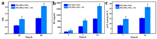 After 12 h of the MC3T3-E1 cell culture, the constant ES was applied on cells for 2 h a day until 14 days. It could be seen that continuous ES can significantly increase the adhesion and proliferation of MC3T3-E1 cell (Figure 6a), the number of MC3T3-E1 cells on PPy/PDA NWs coatings was almost doubled higher after ES was applied. Additionally, the total protein content and ALP activity tests relating to the proliferation and osteogenesis activity of MC3T3-E1 cells both revealed that the ES could promote the osteogenic differentiation of MC3T3-E1 cells (Figure 6b,c). It was noticeable that the total protein content and ALP activity value of MC3T3-E1 cells with ES at 7 days was very close to that of the cells without ES at 14 days, which proved that the PPy/PDA NWs coating together with ES addition could accelerate the cells entering the mature stage of osteogenic differentiation.