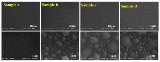 The surface morphology and topology of pristine BOPP film and corona BOPP film was measured by SEM and AFM. As shown in Figure 4, the surface of pristine BOPP film is all smooth at different magnification rates (Figure 4 Sample a) while the surface of corona BOPP film presents a lot of uniform and uneven bulges (Figure 4 Sample b, Sample c, and Sample d). The increment of the surface roughness of the corona BOPP film is due to the fracture of polymer chains during the corona treatment. The etching effect onto pristine BOPP film becomes more obvious with the increment of the corona time and the corona power. The impact points can be clearly seen at the same magnification rates especially in magnification SEM images of Sample d, which are attributed to the bump onto the film owing to the electron flow during high voltage discharge.