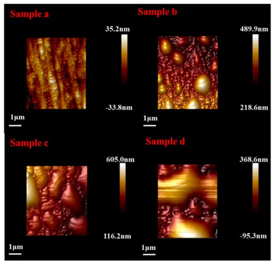 As shown in Figure 5, many bulges appear on the surface of corona BOPP film and the bulge volume increases gradually with the increment of the corona time and corona output voltage. In the AFM image of Sample d, because Sample d has the longest corona output voltage and corona time, small bulges become large bulges. The average surface roughness of BOPP film rises from 7.81 nm to 59.8 nm (Supplementary Materials Table S1), which is consistent with the SEM test results and is attributed to the formation of many high-energy substances under high pressure. When high-energy particles strike the surface of the film, tiny pits are formed. The interaction between electron and the surface of PP film can also lead to surface etching effect by the rapid removal of low molecular pollutants, such as additives, processing aids, etc. In addition, the molten materials or sputtered fragments are heated and evaporated in the interaction region through the adsorption of electron energy, which can result in the changes of surface topology and roughness. The surface roughness of the corona film depends on the properties of the electron beam. With the increment of electron beam flow, the surface energy of polymer increases, and the surface roughness of the film is improved.