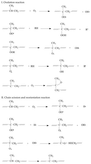 Polypropylene (PP) as a thermoplastic resin is an important member of polyolefin (polyethylene, polypropylene, polybutylene) and is also one of five general synthetic resins (polyethylene, polystyrene, polypropylene, polyvinyl chloride, and acrylonitrile butadiene styrene plastic) [1,2]. It can be divided into two categories according to composition difference: homopolymer polypropylene and copolymer polypropylene [3,4,5]. Meanwhile, it includes three types based on structure difference: isotactic polypropylene, anisotropic polypropylene, and atactic polypropylene [6,7]. Because the biaxial stretch polypropylene (BOPP) film will undergo transverse and longitudinal stretching deformation in the molding process compared with that of the non-stretch film, the arrangement of its molecular chains or chain segments will be changed. Herein, the performance of the film is significantly improved [8,9,10]. Because BOPP film has excellent mechanical properties, chemical resistance, cold resistance, heat resistance, good barrier, and low price, it has become the most widely used packaging material and is known as the “packaging queen” [11,12,13]. Although BOPP film has many outstanding properties, its chemical structure does not contain active groups. Meanwhile, many reasons make it difficult to be wetted and bonded [14,15,16], such as high crystallinity, low surface energy, chemical inertness, surface pollution, and the existence of weak boundary layer. In particular, the poor wettability greatly limits the application of the BOPP film in ink, adhesives, composite materials, heat sealing, and coating area. Therefore, the secondary treatment of the BOPP film is necessary for improving its wettability and adhesion [17,18]. Scientists have developed many secondary treatment technologies, such as corona treatment, chemical surface grafting, acid oxidation, gamma irradiation, chemical coating, flame treatment, ion implantation, and so on. As we know, the corona treatment has the advantages of short time, fast speed, simple operation, and easy control [19,20,21]. Moreover, the corona treatment is especially beneficial for improving the surface activity of the substrate before the film printing, polymerization, recombination, and bonding processes [22,23,24,25,26]. However, the corona effect of the film is unstable, and it will degrade with the change of storage time or environment, so the as-treated material should be used instantly. The typical corona discharge processing diagram is shown in Scheme 1. After the corona discharge treatment, the carbonyl or nitrogen-containing polar functional groups can be generated on the molecular chain of the polymer material to meet the pretreatment requirements of top-grade printing, polymerization, coating, and gold stamping processes. Thus, the understanding of chemical reactions during corona treatment for BOPP film is essential to diverse downstream applications. Christine et al. proposed that the chemical mechanism of corona treatment is oxidation [22]. The oxidization reaction can produce the polar functional groups on the film, which can improve its surface energy, wettability, and adhesion property. Vishnuvarthanan et al. asserted that the oxygen plasma treatment can generate the oxygen-containing polar functional groups on the polypropylene film and induce the chemical composition variation of materials [23]. Mercado-Cabrera et al. proposed that the morphology of the polyprolylene film will change after plasma oxidation treatment [24]. Navaneetha Pandiyaraj et al. thought that the C=O, O–C–O, and C–N functional groups are incorporated on PP films after corona treatment, which will improve its wettability [25,26,27]. Dong et al. studied the mechanism of corona treatment of polyolefin films, specifically the chemical and physical changes of this process and put forward the self-adhesion mechanism [28]. Some researchers investigated the behavior of corona treatment for PP films. They generally thought that the surface properties of film are improved owing to a series of complex reactions from corona, such as surface cleaning, activation, crosslinking, and etching. However, the theoretical reactions of the corona discharge treatment for BOPP film have not been proved in detail until now and the involved chemical reaction processes are still unclear. For example, there is no specific theoretical study on how the oxidation reaction occurs, what groups are oxidized, and what the structural formula is after oxidation, and for chain scission and reorientation reaction, which molecular chain breaks and what the process of rearrangement reaction is.