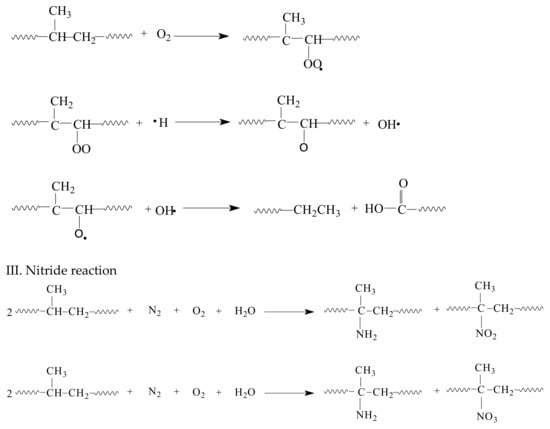 Based on the test results of ATR-FTIR and XPS, the involved chemical reactions of corona BOPP film are summarized in detail. Corona discharge treatment refers to complex reaction processes. Moreover, oxygen-containing polar functional groups, nitrogen-containing polar functional groups and some small free radicals are all produced during corona discharge treatment. Meanwhile, high voltage electron shock can effectively remove water vapor, oil and dust from the surface of the film. The related chemical reactions are shown in Scheme 2.