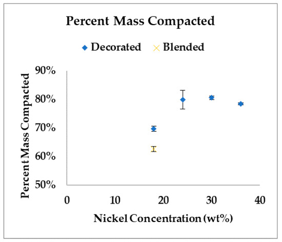 Figure 2 shows percent mass compaction as a function of the nickel concentration for all powders evaluated. It was observed that adding nickel improves the compaction efficiency of the WC–Co. It can also be seen that the blended powder has lower compaction efficiency than its decorated counterpart of the same nickel composition. From these data, it can be hypothesized that the addition of nickel on the surface of the core particle will improve the deposition efficiency of the WC–Co during cold spray consolidation.