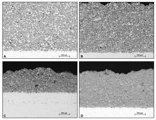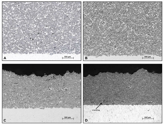 Cross-sections of deposits cold sprayed using different concentrations of nickel in the synthesized powder and the VRC NZZL0082 nozzle; (A) 36 wt.% Ni deposit, (B) 30 wt.% Ni deposit, (C) 24 wt.% Ni deposit, (D) 18 wt.% Ni deposit.