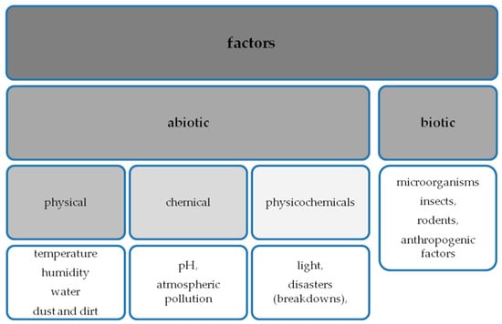 The ability of microorganisms to degrade building materials depends on several factors. Biodeterioration takes place in close relation to the chemical and physical factors affecting the microorganisms. The growth and development of microorganisms is stimulated by external stimuli, i.e., environmental factors. Microorganisms display a relatively wide range of tolerance to changes in environmental conditions. Under the right conditions, microorganisms develop very well. Under adverse conditions, they can cause the inhibition of cell growth or damage or lead to the death of the microorganism. When considering the effect of environmental factors on microorganisms, it is not possible to identify the most important one. The result of multiple overlapping factors determines the possibility of the growth of specific microorganisms []. The main growth factors are temperature, humidity, concentration of hydrogen ions in the environment, oxidoreduction potential, water activity in the environment, and hydrostatic pressure []. The factors influencing the biodeterioration may be mutually dependent. They can be divided into groups, as presented in Figure 1.