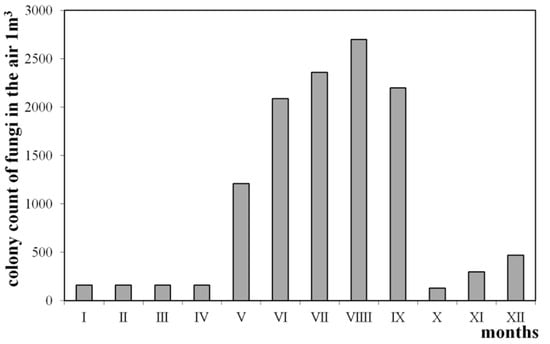 Fungal spores and bacteria are always present in the air. However, their number depends on the species of the microorganism and the season. Figure 3 shows the concentration of mold spores depending on the season []. Approximately 70% of the air microflora is mold spores, the number of bacteria ranges from 19% to 26%. The number of yeasts ranges from 4% to 11%. In summer, the content of mold spores in the air is high.