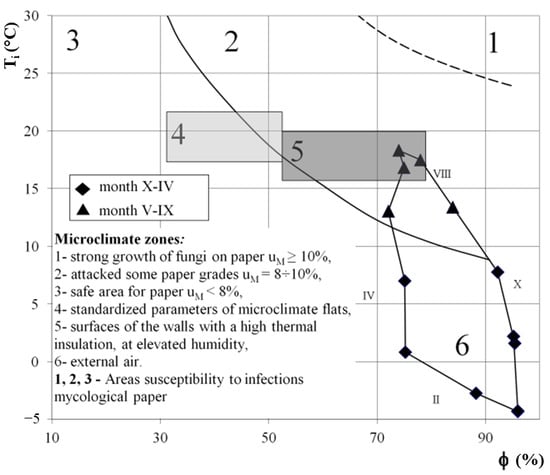 Figure 4 shows microclimatic conditions in dwellings and atmospheric conditions based on microbial contamination susceptibility zones. There is a noticeable shift in the areas that characterize the climatic conditions in the rooms towards the zones at risk of intensive mold growth. In the summer period, there is an intensive growth of microorganisms outside the premises while indoors it is recorded mainly in the autumn and winter period [].