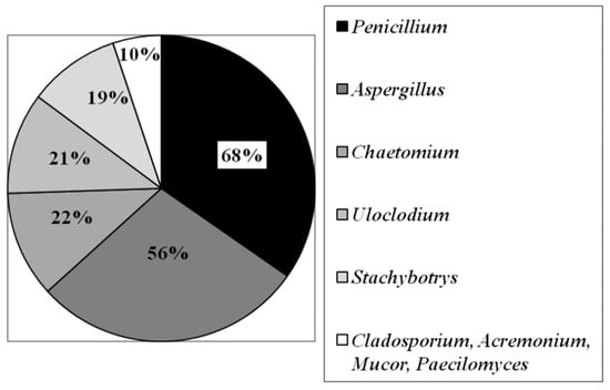 There are many species of microorganisms in the air but the most common are Alternaria, Cladosporium, Penicillium, and Aspergillus [,]. On the other hand, indoor air additionally includes Mucor, Ulocladium, Trichoderma, Chaetomium [,] as well as Fusarium, Stachybotrys, and Trichothecium [] with varied environmental domination. Presented below is a diagram (Figure 5) with the most common fungi isolated from walls and other surfaces in damp buildings. The graph only includes the fungi with the highest rate of occurrence.