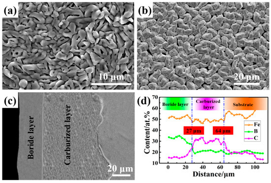 The microtopography of sample is shown in Figure 2. As observed in Figure 2a, the carburized sample exhibits a homogeneous and needle-like microstructure without cracks. In Figure 2b, the boronized layer after carburizing consists of submicron-sized particles and the average roughness of the layer was 1.189 μm. The cross-section microstructure of the borocarburized layer is uniform and even, which is different from the single boronized layer [30]. The boride layer and the carburized layer can be obviously observed along with the depth of the borocarburized layer. Moreover, the penetration of boron and carbon atoms can also reduce the brittleness of the boride layer [3]. As shown in Figure 2d, the EDS result of the cross-section from surface of the coating to along the depth direction of the substrate indicates that the thickness of the boride layer and carburized layer is 27 μm and 64 μm, respectively. It can be found that boron and carbon show a gradient change in the coating, showing complete metallurgical diffusion behavior, which helps to improve the adhesion between the coating and the substrate. In the boronized layer, the concentration of carbon atoms is very low, which is in line with the viewpoint that the solubility of carbon atoms in the boronized layer is very low [31].