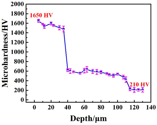 Figure 4 depicts the microhardness distribution of the borocarburized layer. As observed in this figure, the maximum hardness of 1650 Vickers hardness (HV) is obtained for the top boride layer. However, the hardness of the original steel substrate is only 210 HV, indicating an obvious enhancement in hardness after introducing the borocarburized layer. Additionally, the hardness of the transition carburized layer is around 600 HV. Therefore, the introduction of the carburized layer reduces the hardness gradient of the single boride layer and improves the comprehensive mechanical properties of the coating [33]. Meanwhile, the surface hardness of the borocarburized layer is much higher than that of the carburized layer, which is beneficial to wear resistance. In fact, the surface microhardness and brittleness of the Fe2B phase layer are lower than those of FeB phase. Due to the extremely high internal stress during cooling, there are many risks of cracks and spalling in the surface area of FeB/Fe2B layers [3,9].
