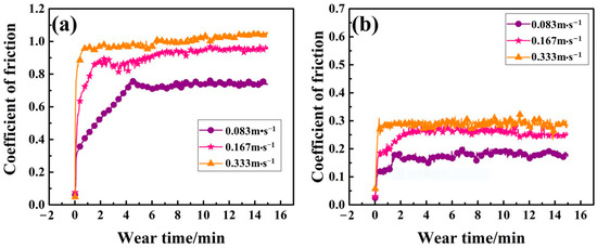 Friction coefficients under dry-sliding against ZrO2 ball with 0.083 m·s−1, 0.167 m·s−1 and 0.333 m·s−1 speed (a) substrate; (b) borocarburized layer.