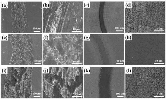 Wear morphology of wear track of (a,b) substrate under 0.083 m·s−1 speed, (c,d) borocarburized layer under 0.083 m·s−1 speed, (e,f) substrate under 0.167 m·s−1 speed, (g,h) borocarburized layer under 0.167 m·s−1 speed, (i,j) substrate under 0.333 m·s−1 speed, (k,l) borocarburized layer under 0.333 m·s−1 speed.