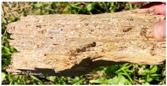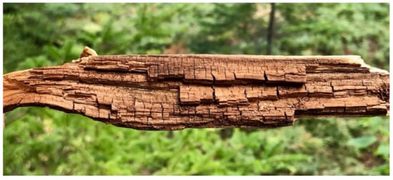 Wood decay is largely caused by fungi that fall into categories depending on the appearance of the degraded wood which is, in turn, related to polymeric materials that are degraded. Brown rot decay is an informal name for the most common type of decay occurring in timber products. Fungi that cause brown rot depolymerize cellulose and hemicellulose (holocellulose) for digestion, while lignin is also depolymerized and modified before being rapidly repolymerized. The general categories of white rot fungi and soft rot fungi are the other major types of decay, and these are covered later in this review, as these fungal decays can be quite important in certain environments. Fungi are Eukaryotic organisms that are in the same Domain in the Tree of Life as plants and animals []. Species within other Domains in the tree of life comprising the Bacteria and Archaea can also live in wood. Some species of Bacteria have been shown to cause limited wood deterioration over long periods of time (several centuries), resulting in mechanical property loss in wood. Because of their minor importance in deterioration of structures, these microorganisms will not be considered further in this chapter, although we recognize that they are almost always present and have been suggested to play supporting roles in the degradation process including pre-conditioning of wood, and extractives detoxification. Bacteria are also active in long-term degradation of submerged wooden foundation piling, which typically occurs over many centuries []. Insects and some types of marine boring animals also can cause significant biodeterioration of wood under some circumstances, but deterioration by these animals is reviewed elsewhere [].
