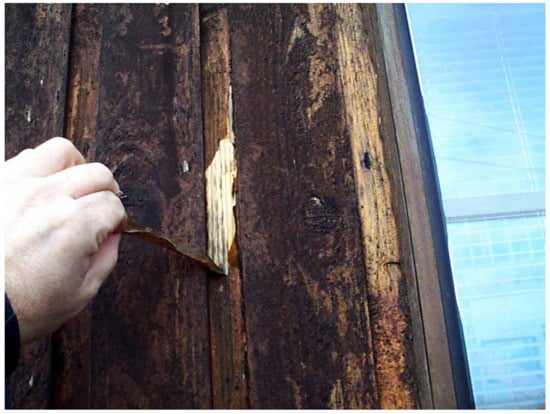 Wood weathering is the most common type of non-biological degradation occurring in exterior-use wood []. The low energy levels in sunlight can be quite disruptive to the polymeric components of wood at the molecular level. During UV (sunlight) exposure, the primary energetic components which can attack lignocellulose are reactive oxygen species (ROS or oxygen radicals) that randomly attack the cell wall polymers, especially lignin. This energy transforms lignin into a variety of radical forms that transfer the energy to hemicellulose and cellulose which are then readily depolymerized [,]. This process begins almost immediately after timber is exposed to sunlight, but the effect on the timber is shallow until the outer layers of UV-degraded wood are sloughed off. Weathering related to UV exposure is typically slow but can have substantial effects on adhesion of coatings as well as declines in appearance leading to premature replacement. For example, a preweathering exterior exposure of Western redcedar siding in direct sunlight for 1, 2, 4, 8 or 16 weeks prior to being painted reduced paint adhesion by up to 50% [,]. Increased preweathered was associated with shorter paint service life: paint on panels preweathered for 16 weeks began to flake and peel after 4 to 5 years; preweathering for 8, 4, 2 or 1 weeks resulted in paint failures after 7 to 8 years, 9 to 10 years, 10 to 11 years or 13 years, respectively. Coatings on non-preweathered controls were still in almost perfect condition after 17 years of exposure.