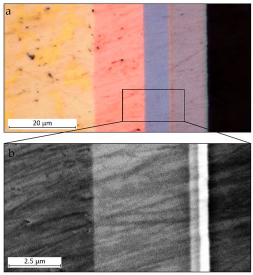 The last step in sample preparation is lapping. Near the cut, the sample will inevitably be damaged, and the films will be altered; there may be peeling of the films, meaning the detachment of the less adhered films, and a spreading of the softer films. The lapping process is the longest phase; it can take several hours and consists of polishing the section of the sample with gradually finer abrasives until a mirror surface is obtained. The surface roughness and scratches must be minimized in order to accurately measure the thicknesses; as a rule of the thumb, the surface roughness and consequently the abrasive grain size must be in the same order of magnitude or less of the thickness to be analyzed, generally 0.3–1 micron. The lapping process can be carried out by hand or using special automatic lapping machines. Wet abrasion is carried out first using gradually finer sandpaper and then with a cloth soaked in an abrasive suspension. The suspended particles can be alumina or diamond dust. Initially, with sufficiently coarse sandpaper, the entire part that was damaged during cutting is removed, about 1 mm in depth; then, the grain size of the sandpaper is decreased. Fine-grain size is not used immediately, as it would not be possible to remove the deepest scratches. In the event of lapping by hand, the sample must not be pressed too hard, and care must be taken not to consume one side more than the other to avoid introducing a parallax error. For this reason, it is advisable to rotate the sample in the same direction as the lapping machine disk and occasionally turning it by 90° with respect to its normal axis. When the sample is thought to be ready, it is washed and inspected visually or, if available, under an optical microscope to check that all the scratches have been flattened. If the sample is sufficiently smooth, the next phase of microscopic analysis can be carried out. By way of example, a microscopic analysis of the same cross-section is shown in Figure 1, where a comparison between an optical and electron microscope is shown in the image. The multilayer sample is made of brass/Cu/bronze/Pd/Au/Ni. With the optical microscope, it is possible to distinguish most of the layers. Even the thin gold layer is visible, although not quantifiable; it is not possible to discriminate between the bronze and palladium layers. Layers with a thickness over 500 nm can be measured with an optical microscope, but for thinner coatings, and to distinguish brass and palladium, the electron microscopic image is necessary.