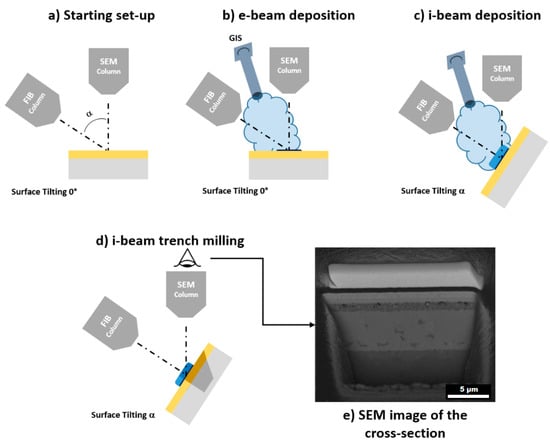 Even if the cross-sectioning process can be performed only by using an FIB for the coarse determination of thick films, precise determination of films down to 10 µm will require the use of an FIB/SEM equipped with the GIS. This is because in order to avoid FIB-induced surface erosion, the surface of interest has to be covered by a thin protective layer. In FIB/SEMs, the protective layer is produced by a two-step deposition process. First, a thin layer of metal is deposited on the surface using the electron beam (e-beam deposition). Then, a thicker metallic layer is deposited using the ionic beam (i-beam deposition). The e-beam deposition is needed to avoid surface degradation (and thus loss of thickness information on the topmost layer) due to direct impingement of the ionic beam on the surface []. The full workflow for the preparation of a cross-section using an FIB is shown in Figure 2.