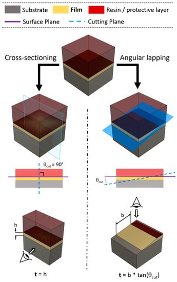 During traditional preparation procedures, to obtain the stratigraphic information from the sample, the cutting plane is perpendicular to the surface (θcut = 90°) []. The uncovered section gives direct stratigraphic data on the displacement and thicknesses of the layers above the substrate. However, in angle lapping, the sectioning cut is performed at very low angles with respect to the sample surface (θcut < 10°) (Figure 3). This produces a “magnification effect” on the newly created section surface, on which all the layers appear stretched. Knowing the cutting angle and using trigonometry, it is consequently easy to derive the film thickness. The main advantage of this method is the magnification effect, which allows the resolution limits of the microscopic technique adopted for the quantification to be overcome, even for extremely thin films. A very flat film surface is mandatory for the precise determination of the thickness of the layers underneath; moreover, the operator must put special care into the preparation of the surface after the cut. It is common, especially for mechanically-machined soft materials, to introduce thin-film deformation onto the cutting surface []. The origin of this sample preparation technique comes from the first metallographic studies, and it is still considered as a valuable and low-cost method to overcome the resolution limits of optic microscopy characterization methods. In time, its adoption has shifted to FIB cross-sectioning or lamella preparation, enabling fine characterization of ultrathin films.