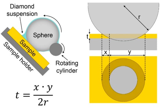 This technique consists of fixing the sample on a variable angle support, onto which is placed a steel sphere covered by an abrasive suspension; the sphere is also in contact with a rotating cylinder that makes it roll (Figure 6). Within a few minutes, depending on the hardness of the sample and its angle of inclination, which is translated to the weight that the sphere impresses on it, a circular crater will form, revealing all the layers []. Since the abrasion angle is small (due to the diameter of the sphere), layers of even a few microns will have a much greater apparent size and can be appreciable under a standard optical microscope. As in the case of the cross-section, only the layers having a different color can be distinguished. Once the diameters of the concentric circles that have been created on the sample have been measured, using a dedicated formula (Figure 6) that takes into account the diameter of the abrasion sphere, the real thickness of the films can be obtained. Manufacturers ensure that the range of thicknesses that can be measured is between 50 and 0.1 microns.