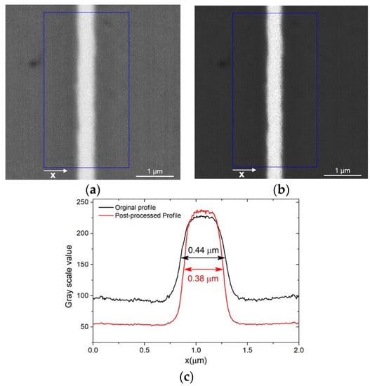 Once the image is obtained with a microscopic technique, pixels must be converted into a unit of length. Most the software that allows microscopic images (both optical and electronic) to be acquired commonly have a tool for the extraction of this information; otherwise, there are free or paid for software that allows the same job to be done, e.g., ImageJ, Gimp and Adobe Photoshop. In order to convert the pixels to lengths on the image, a reference scale must be printed on it, and through that scale, all the dimensions of interest in the image can be obtained. The thickness of the films can therefore be measured, with the appropriate care taken to ensure the measurement is perpendicular to the film. By making the measurement at several points, statistics of the thicknesses can also be carried out. However, in the event that the edges of the film in the image are not very defined, finding the limits by eye can be difficult, as shown in the blurred image of an Au film reported in Figure 1. In these cases, instead of analyzing the image, it is more practical to observe the profile graph in which the greyscale values are reported. If the different layers have a contrast between them, they also have a distinct grey value; the delimitation between one layer and another can be defined as the point where the value is intermediate between the two layers or, more rigorously, at the inflexion points of the graph. In this case the spatial resolution, and therefore the uncertainty of the measurement, is defined as the distance between the points where the variation of the grey value is in the range of 20%–80% [], as required by ISO 18516 []. On the other hand, an incorrect method to make the separation of the layers more defined is to digitally postprocess the images by acting on brightness and contrast. In fact, as opposed to varying these parameters during the measurement, by performing software alterations of the image, the edge of the film can move as the different shades of grey are processed, as demonstrated in Figure 9.