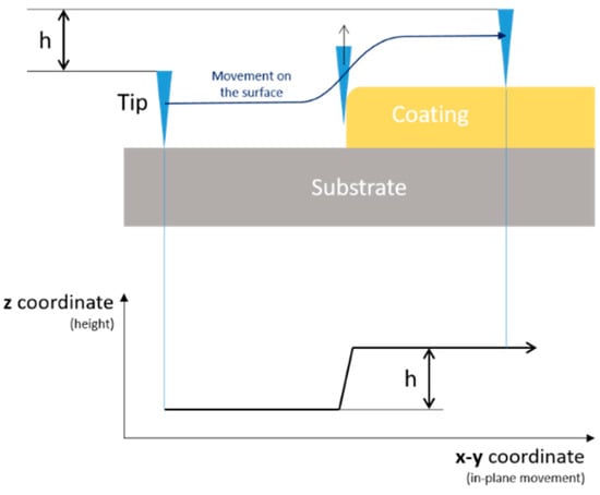 Profilometry is a class of techniques that permits the characterization of the line profiles of surfaces. It can be divided into non-contact and contact profilometry, depending on the probe used. In non-contact profilometry, light is used as the probing medium; information is then extracted using interferometric methods. On the contrary, contact profilometry relies on the use of a sharp needle, the tip of which is shifted horizontally on the sample surface by following a predetermined pattern. During this in-plane (x–y) movement, the needle is free to move on the vertical (z) axis according to the surface profile, and thus to collect the height value with respect to the horizontal movement, giving a line-profile of the surface []. Contact profilometry is the oldest profilometric technique but is still widely adopted in industrial contexts to acquire fast information on surface roughness. Contact profilometry can also be used to determine the thickness of thin films adopting the “scratch method”. This technique exploits discontinuities on the coating surface, which uncover the base substrate underneath. By horizontally moving the tip between the substrate surface and the coating surface, it is then possible to record a height difference between the base material and film surface and thus determine the value of the coating thickness (Figure 10). Despite its apparent simplicity, the scratch method has some intrinsic limitations: (a) Test samples have to be prepared accordingly, with coating-free zones for the substrate height measurement or (b) a scratch has to be performed on the continuum of the sample coating, to uncover the substrate. This second procedure is risky because the base surface can easily be deformed by the scratching process, hindering precise thickness measurement. Moreover, coatings could show different thickness values near the boundaries with the uncovered zones, both due to a “border effect” arising during the film deposition or to plastic deformation during the scratching of the surface. It is then mandatory to perform various line acquisitions to acquire some profile statistics.