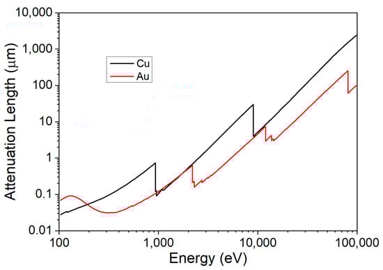 X-ray attenuation length as a function of the energy of the photons for copper and gold.