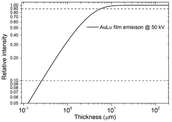 XRF is the most common instrument used by industries for film thickness investigations, since it is fast, non-destructive and relatively simple to use, making it perfect for the quality control of the products [,]. For this reason, there are also standard procedures to measure for compliance with ISO 3497 [] and ASTM B568 [] regulations. Commercial instruments can measure easily the thickness of almost any material (with some restrictions for lighter elements), whether conductive or not, in the range from 10 nm to 100 µm [,]; nevertheless, depending on the materials under investigation and the instrumental settings, the limits of measurement can be extended from less than 1 nm [] to a few centimeters []. The lateral resolution of XRF is very low, and the spot size commonly ranges from 0.1 to 15 mm. The relative intensity (normalized respect to a bulk element) of an emission from a film follows an exponential trend [] but can be approximated to a second-order curve for small ranges far from the saturation thickness []. The emission of a gold film on a Cu substrate, as a function of the thickness, is reported in Figure 13 using a log–log scale. In this case, the range of thicknesses between the relative intensities of 0.9 (semi-infinite thickness []) and 0.1 (infinitely small) of gold is between 0.2 and 50 µm.