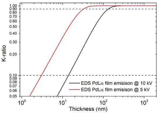 - Pascual, R.; Cruz, L.R.R.; Ferreira, C.L.L.; Gomes, D.T.T. Thin film thickness measurement using the energy-dispersive spectroscopy technique in a scanning electron microscope. Thin Solid Films 1990, 185, 279–286. [Google Scholar] [CrossRef]