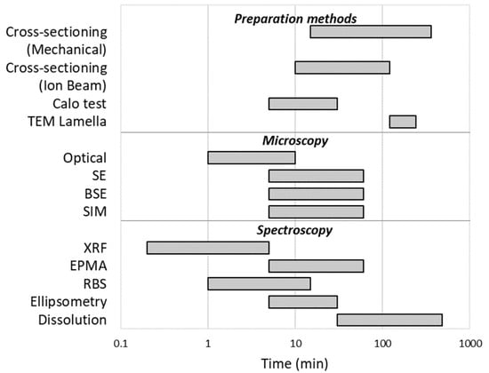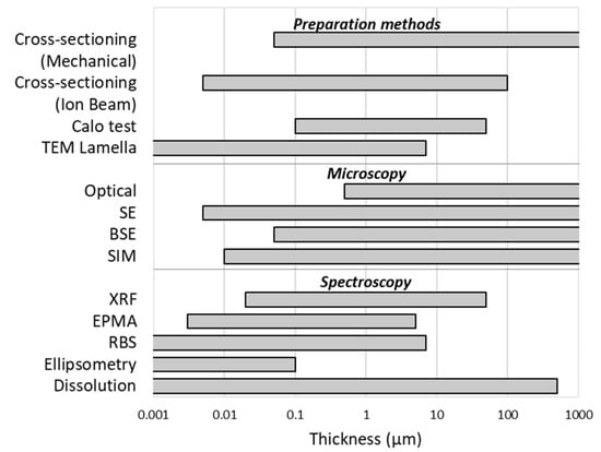 Additional analytical techniques only require the sample surface to be properly cleaned. These techniques analyze the sample along the direction perpendicular to the surface instead of using a lateral view of the cross-section. Regarding the microscopy techniques, these do not provide direct information about the thickness and the signal must be analyzed to deconvolute all the information that it contains. For this reason, we must obtain as much information as possible about the sample to make the right assumptions based on its nature and to obtain reliable results. In addition to being an excellent technique for compositional determination, X-ray fluorescence spectroscopy is by far the most common technique used in the industrial field for thickness measurement and quality control, as it allows for fast, non-destructive analysis with minimal sample preparation []. XRF is a very versatile technique, since the sample can be either solid or liquid, a metal or a dielectric. Most of the elements can be detected in normal ambient conditions. For the lighter elements the measurements are performed under vacuum conditions or a helium atmosphere, because most of their emission is absorbed by air. The thickness can be extrapolated from XRF data by means of standards [], using the analytical equations of the fundamental parameter method (FP) [] or through Monte Carlo (MC) simulations [,,]. Other non-destructive techniques, more commonly used for research purposes, include ellipsometry []—however, this is rarely applicable to metallic coatings (it is mainly adopted for optically transparent coatings)—and X-ray reflectivity (XRR) [,] that can detect thicknesses that range from tens of nanometers to a few micrometers. Although they are commonly used for quantification purposes, even electron probe microanalysis (EPMA) [,] and X-ray photoemission spectroscopy (XPS) [,,] can be employed to determine thickness information up to the atomic scale. The methods used for deconvolution of the signal range from the use of standards [,], MC simulations [,,], attenuation length [,] and three-layer-model or multilayer model analysis [,,,,,]. Additionally, Rutherford backscattering spectroscopy can be used for the determination of film thickness [,]. Furthermore, the thickness of a coating can be determined by destructive sputtering techniques [] in which the sample is bombarded with ions, the surface is slowly removed, and the emitted elements are analyzed by carrying out a depth profiling analysis. Depth profiling analysis can be performed with secondary ion mass spectrometry (SIMS) [,] or XPS sputtering. Data interpretation and thickness evaluation can be performed using the Laplace transform or maximum entropy method [,,,,]. All of the techniques covered in this review are summarized in Table 1.