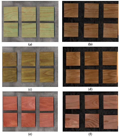 1. Sandak, A.; Sandak, J.; Dimitriou, A.; Burud, I.; Thiis, T.K.; Gobakken, L.R.; Ormondroyd, G.A.; Kraniotis, D. Assessment and monitoring of aesthetic appearance of building biomaterials during the service life. WIT Trans. Ecol. Environ. 2017, 226, 527–536. [Google Scholar] [CrossRef]