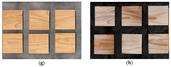 Figure 3. Red pine sapwood before and after 1000 h of accelerated photo-degradation: (a) treated with micronized basic copper carbonate, (b) treated with micronized basic copper carbonate after 1000 h of accelerated photo-degradation, (c) treated with micronized basic copper carbonate with a peroxide post-treatment, (d) treated with micronized basic copper carbonate with a peroxide post-treatment after 1000 h of accelerated photo-degradation, (e) treated with an iron oxide-based colorant, (f) treated with an iron oxide-based colorant after 1000 h of accelerated photo-degradation, (g) untreated, and (h) untreated after 1000 h of accelerated photo-degradation.