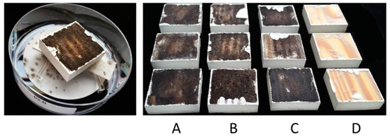 Figure 4. Test assembly showing unweathered red pine sapwood covered with black-stain fungi after two weeks of incubation (left); unweathered red pine sapwood samples after six weeks of incubation with inoculum groups A, B, C and D (uninoculated) (right).