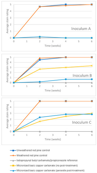 Figure 5. Average stain ratings over a six-week incubation for specimens exposed to strains of Aureobasidium pullulans from inoculum groups (AC).