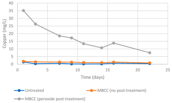 Copper leaching from the wood treated with MBCC was very low and similar to the untreated control (Figure 6). This is consistent with previous work demonstrating the low leachability of copper from wood impregnated with MBCC [24]. In contrast, copper leaching was much greater in the samples post-treated with peroxide, though this tapered off substantially after 22 days. During the leaching experiment, it was observed that water uptake during immersion was much greater in the peroxide post-treatment group (average 6.4 g) than in the no post-treatment group (average 3.4 g). This increase in water uptake may explain the greater degree of leaching observed.
