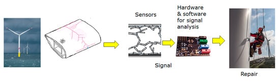 The SHM of blades can be realized using vibration monitoring, strain measuring, acoustic emissions, impedance techniques, ultrasonic waves, smart paint, laser vibrometry and ultrasound, impedance tomography, thermography, and nanosensors [13,19,20,21]. Different types of sensors can be employed, e.g., PZT wafers, fiber optic sensors, accelerometers, MEMS, etc. Initial health monitoring systems were developed for static testing, e.g., acoustic emission (AE) and coherent optical (CO) techniques developed in [22], and acoustic emission (passive listening) based structural neural system with piezoelectric sensors developed by NREL [23]. The structural health monitoring of the blades includes acquiring and analyzing data from sensors in the given structure and evaluation of the integrity and health of a structure [24]. The SHM system should include sensors, attached to the structure, corresponding hardware (data handling) and software for the data analysis. Figure 1 schows a schema of the information flow from blade damage via SHM to repair.
