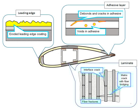 Sørensen et al. [69] identified different types of damage of wind turbine blades: skin/adhesive debonding (including buckling induced skin/adhesive debonding), adhesive joint failure, sandwich debonding, delamination, splitting along fibers, and cracks in the gelcoat.