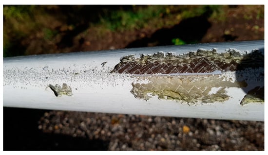 With a view on repair procedures, wind turbine blade damage is classified as: (a) surface erosion, (b) non-structural damage, and delaminations (b) and (c) structural damage, with fiber failure [61,62,70]. The surface erosion is caused by fatigue from repeated rain drop and hail impacts, causing surface microcracks, leading to pits, gouges, delaminations, and surface roughness, which in turn reduces the energy production of the wind turbine [71,72]. The surface roughening has also an effect on the wind turbine noise [73,74]. Eroded blades increase dramatically the noise generation [75]. Figure 3 shows a photo of an eroded blade.