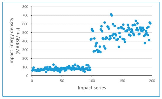 Figure 4 shows a typical output reading with each point corresponding to a single pellet impact. The y-axis shows a value corresponding to the energy density index for each impact, being calculated from the area under the stress waveform (MARSE—measure of the area under the envelope of the rectified linear voltage time signal) detected by the sensor in the underlying laminate divided by the duration of that waveform (in milliseconds). The change in this value indicates the point at which local failure of the leading edge protection capability at the impact point occurs.