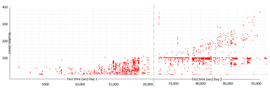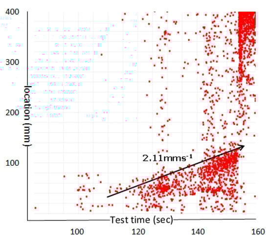 The test took place over two days and the localization distribution from both days is shown in Figure 8 with the linear array along the length of the test specimen in the y-axis, and test time along the x-axis.