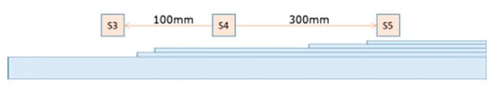 Dynamic plydrop test: An identical plydrop tensile test specimen was dynamically loaded (at 3 Hz) to observe progression of the initiated plydrop delamination under fatigue. Dynamic loading of the specimen increased the “noise level” in the test and it was therefore necessary to add guard sensors (S1 and S2) near the grips, and an extra sensor along the linear array (S3, S4, and S5) in order to extract the localization information that was so easily achieved with two sensors under static loading. This sensor array is shown in Figure 7.