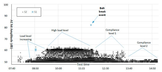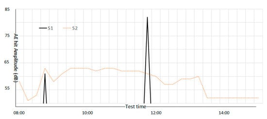 Figure 9 shows AE activity from two sensors for the entire day of blade testing with the amplitude of each detected hit on the x axis and time of day along the y axis. Sensor 1 (S1-O) was mounted near the root, Sensor 2 (S2-x) was mounted on the loading spar at a high bending moment radius of the blade.