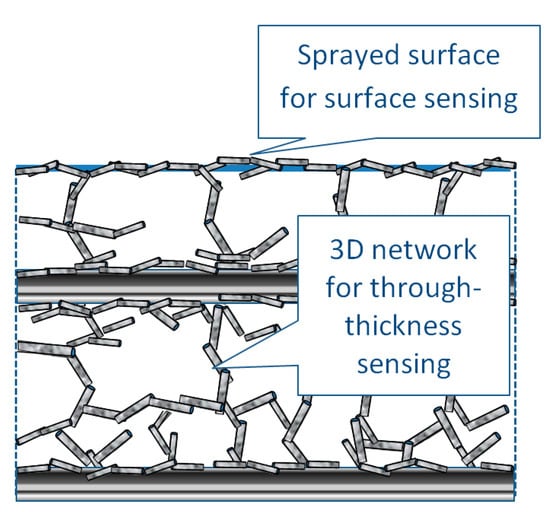 The conductive nanoparticles (for instance, carbone nanotubes/CNT, graphene, and Mxenes) embedded in the composites and polymer layers can enhance the toughness and fatigue resistance of the materials [46,47,48,49], but also be used as nanosensors. The nanoparticles are arranged in networks, layers, agglomerates, or fibers, creating the conductivity path in the material. The electrical resistance of the materials with nanoparticles is changed under deformation and failure, due to changing, eventually broken, contact between adjacent carbon nanoparticles, thus, changing the percolation path, and the change in the tunneling resistance between two adjacent nanoparticles, due to changing distance between them. Kang and colleagues [50] used multiwalled carbon nanotube reinforced PMMA polymer as a piezoresistive strain sensor for structural health monitoring. They considered the nanotube strain sensor as a biomimetic artificial neuron, which can be used for detecting large strains and cracking. Sam-Daliri et al. [51] proposed to use the multiwalled carbon nanotubes (MWCNTs) loaded epoxy composites to sense strain changes under tension load using an AC impedance measurement setup. They demonstrated high sensitivity of the impedance reading. Dai [52] developed a carbon nanotube (CNT)-based nonwoven composite sensor that can be integrated with a difference imaging-based electrical impedance tomography (EIT) sensing scheme to offer a true two-dimensional damage sensing methodology. The system allows estimating damage location, size, and severity. Grabowski et al. [53,54] developed MWCN/polymer (acrylic and epoxy) based sensors and then applied to the test material with the use of two techniques (screen printing and spray coating). They tested the sensors and demonstrated the usability. Li et al. [55] proposed fiber-reinforced polymers with an embedded graphene sensing network connected to the guided ultrasonic wave (GUW)-based structural health monitoring (SHM) system. The tunneling effect, triggered by guided ultrasonic waves makes it possible to avoid use of conventional ultrasonic transducers, creating the possibility of self-health monitoring, without using external sensors.