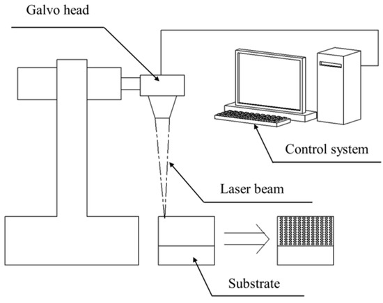 The chemical compositions of medium-carbon steel and GCr15 are presented in Table 1. The specimens were cut to 25 × 25 × 10 mm3. The biomimetic surfaces of the specimens were manufactured by an Nd: YAG Laser (Directed Light Inc. San Jose, CA, USA) with a wavelength of 1.06 mm, and the schematic diagram of sample preparation is shown in Figure 1. During the experiment, the spot diameter was 0.4 mm, the laser output energy was 4 J, and the maximum laser power was 800 W. The prototype of the sample surface is the micro-pits covering the surface of the crucible. Table 2 shows the laser parameters for processing bionic units. The geometric parameters of the biomimetic samples are shown in Table 3, in which the density is the area ratio of the biomimetic surfaces to the total surface. The morphology of a single biomimetic unit is shown in Figure 2, which was observed by using a laser scanning confocal microscope (LSCM) (Olympus LEXT OLS 3000, Tokyo, Japan). The microstructures of the bionic units were analyzed by scanning electron microscopy (SEM) (Zeiss EVO 18 Special Edition, Jena, Germany). An X-ray diffractometer (XRD) (BRUKER D8 FOCUS X, karlsruhe, Germany) was used to analyze the phase of medium-carbon steel both treated by laser and untreated. The schematic arrangement of the laser texturing experiment is shown in Figure 1.