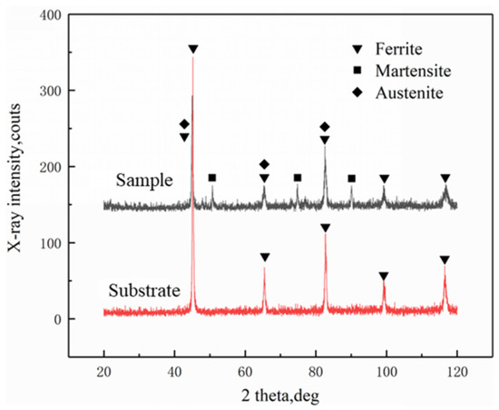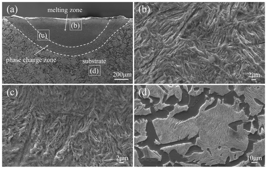 Figure 4 presents that the microstructures of the biomimetic surfaces were different from those of the smooth surfaces. The biomimetic unit included three different zones: the melting zone, where materials were melted completely; the phase-transition zone, where the transformation took place; and the substrate, where no changes occurred (Figure 4a). As shown in the XRD pattern (Figure 5), the substrate was composed of coarse pearlite ferrite. As melting and solidification occur within an extremely short interaction time and are confined only to the top surface, the substrate can act as an infinite heat-sink without any noticeable change in the microstructure [31]. The microstructure of the melting zone (Figure 4b) was mainly composed of martensite and a small amount of retained austenite. In the phase-transition zone (Figure 4c), where the heating temperature was lower than in the melting zone, part of the austenite could not be transformed into martensite and instead formed a mixed-type martensite and a large amount of retained austenite, such that the crystal size of the heat-affected zone was larger than that of the melting zone [32,33]. It can be seen by SEM that the microstructure of the melting zone and phase-transition zone was much more refined and homogeneous than that of the substrate grains.
