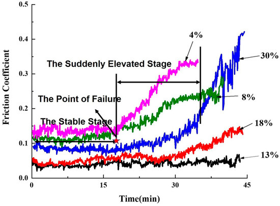 Figure 7 describes the friction properties of different bionic specimens under the conditions of 100 N and 300 rpm. Over time, the friction pair gradually transformed from oil lubrication to starved lubrication, with the friction coefficient of the friction pair remaining at a relatively stable value for a certain period of time, but increasing gradually with the loss of lubricant. In this experiment, bionic samples with texture densities of 4%, 8%, and 30% enter the stage of oil-deficient lubrication in a relatively short time, and the friction coefficient increases at a relatively high rate. Among all of the specimens, the friction coefficient of specimens with 13% and 18% texture densities were more stable than other bionic specimens and the smooth specimen.