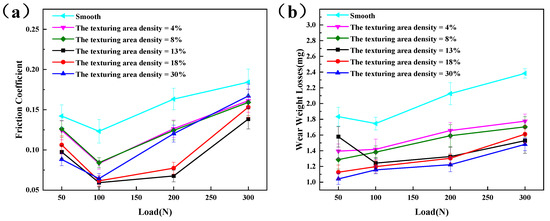 Effect of different texture densities on friction coefficient and wear-weight loss under the constant 300N load: (a) friction coefficient, and (b) wear-weight losses.