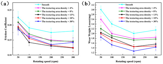 The diagram of the friction coefficient–rotating speed of the biomimetic specimens and the smooth specimen in the stable stage are displayed in Figure 9a. Compared with that of the smooth sample, the friction coefficients of the biomimetic samples were smaller. Among all the biomimetic samples, the specimen with a 13% texture density had the smallest friction coefficient. The friction coefficients of all the biomimetic specimens decreased as the rotating speed increased, mainly because as the rotating speed increased, more lubricant was brought into the interface, the spoiler effect of the contact surface was strengthened, and it became easier to produce an oil film, which decreased the friction coefficient. Given the same total number of rotations, the faster rotating speed shortened the run-in period, which decreased the wear-weight losses of the run-in period. Moreover, the faster rotating speed helped to discharge the debris rapidly and made the interface temperature increase so that the oxide film formed more readily.