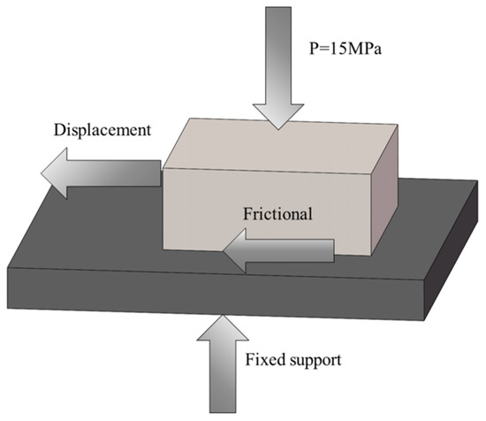 In the friction process, the magnitude and distribution of the contact surface stress greatly affects the wear of the friction surface [34,35]. In this section, we explain why the bionic surface can improve the tribological properties by the establishment of finite element models. The simplified model, shown in Figure 11, consists of two parts: a fixed block and a test block above it. In the simulation experiment, the contact surface of the test block was the “master surface” and contact surface of the fixed block was the “slave surface”. The material parameters are shown in Table 6. In the experiment, pressure of 15 MPa was uniformly distributed on the test block, then the displacement was applied in the horizontal direction of the test block, and the oil lubrication state was simulated by setting the friction coefficient to 0.15. The grid number of the smooth sample is 150,000, and the grid numbers of the biomimetic plates with 4%, 8%, 13%, 18%, and 30% texture densities are 210,649, 236,331, 248,056, 285,959, and 302,653, respectively.
